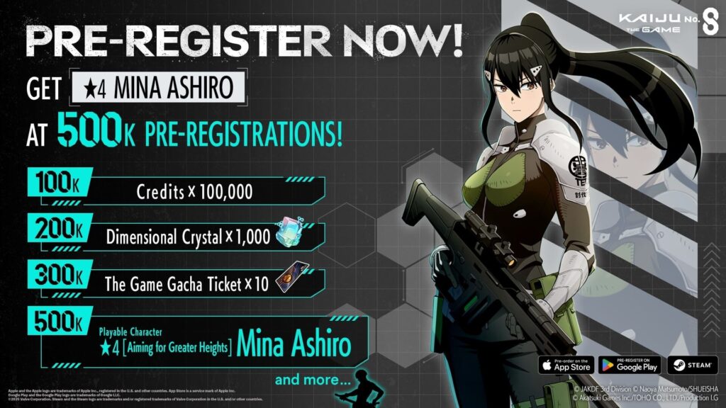 Pre-registration on App Store, Google Play, and Steam started April 25, with enticing milestone-based rewards for all players. Crossing 500,000 sign-ups unlocks playable ★4 character “[Aiming for Greater Heights] Mina Ashiro”; at 850,000, there’s Soshiro Hoshina, and at 1million, a ★5 character of your choice. Other milestones offer in-game currency and gacha tickets.